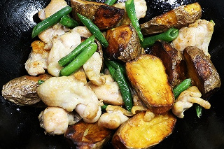 こんがりカリっと揚げたジャガイモに、鶏肉の旨味と辛口スパイスが絡む