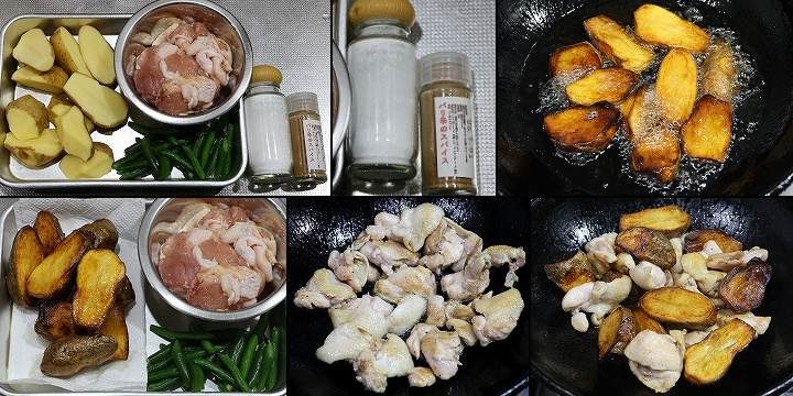 鶏肩肉(またはモモ肉) 270g インゲン 10本 塩 辛口スパイス サラダ油 |
