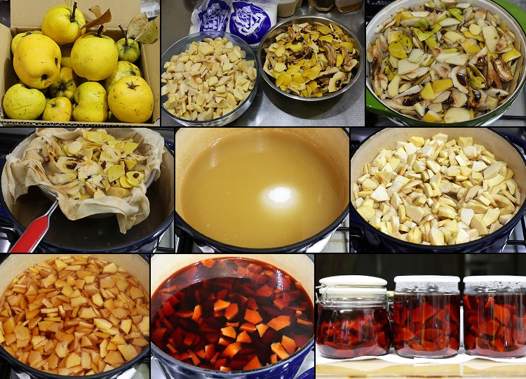 黄色く熟した花梨を使うことが重要。熟した花梨は香りが良く、触ると皮にべとつきがある。自然に落果するくらい熟したものが良いけど、傷が付くと茶色く傷みやすい。また虫食いが多い。傷んだり虫に食われた部分は取り除く。 ジャムの材料は花梨とグラニュー糖だけ。花梨はかなり渋み・酸味が強いので、グラニュー糖は多めでレモン汁は使わない。グラニュー糖の分量は、皮や芯も含めた実全体の重さの50-60%とした。 皮と種・芯を煮詰めるととろみが出てくる。このとろみが大事なので、布巾などでしっかり漉す。煮汁の香りは良いが、色は少し黄色みを帯びてるかなという程度。その煮汁を漉してグラニュー糖を溶かし実を煮ていくと、15-20分くらいでほのかにピンク色、30分以上煮ると綺麗なオレンジ〜ピンク色となる。 果肉は使わず煮汁にグラニュー糖を入れるだけで煮詰めるもの、最後に果肉を取り出すもの、ミキサーにかけるものなど、いろいろなレシピがあるが、自分は果肉をそのまま残す。 花梨の果肉は渋みが強いのでアク抜きするレシピもあるが、自分はアク抜きしない。出来上がったジャムの果肉は、かすかに残る渋みに花梨らしさを感じ、また甘酸っぱくしゃりしゃりとした食感は、パンやヨーグルトはもちろん、ケーキにもよく合う 花梨ジャムのホイップパウンドケーキ下写真は、2025年12月、たくさん収穫できたカリンでジャムを作った時のもの。皮と種の煮出しに3qt Enamel、グラニュー糖を加える煮詰めるのに5qt Enamel DOを使った。 2025年は約4kgものカリンが収穫でき、その半分弱でまず果実酒とハチミツ漬け、残り2kg強のカリンをジャムにしたがさすがに手強く、ジャム用にカットするだけで2時間半を要し、指は真っ赤に腫れ上がり、途中と終わってからの2回、包丁を研いだ。 |