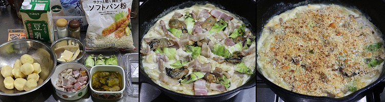 牛乳(or 豆乳)* 300mL 生クリーム* 100mL 牡蠣 150g ベーコン 50g パルミジャーノ 50g パン粉 20g パセリ 大さじ1-2杯 塩コショウ バター 大さじ1杯 |