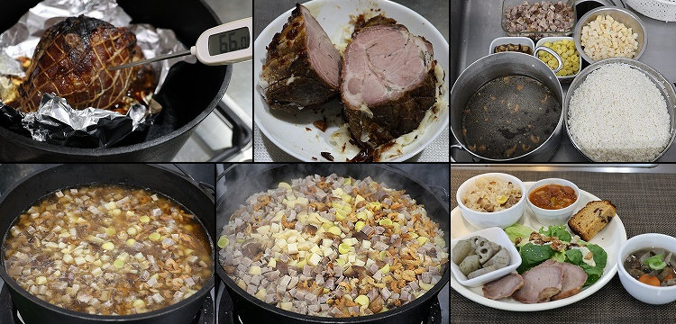 叉焼肉 ・焼き豚スープには顆粒鶏ガラスープを使ったが、“ししジューシー”や“イノシシ炊き込みおこわ”と同じように、豚の茹で汁を使うのも旨い。干しエビは干し貝柱でも可(エビ・アレルギーの方がいる場合など)。 上写真は、R8.1/25、ラピュタファームで行われた料理対決vol.1“豚肉料理”で、約20食分のランチ用にうるち米・餅米各6合で作った時のもの。叉焼は600gくらいの豚肩ロース・ブロックを使った。 下左写真は、うるち米・餅米各2合で作った時のもので、21cm Oijin Jr.を使っている。 下右写真は、うるち米・餅米各3合で作った時のもので、叉焼は250g使用、また空豆も使っている。 |
