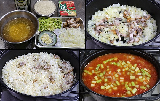 スープは米の3倍量強と多めに用意、顆粒コンソメ適量と塩少々を加えて温めておき、好みの硬さに炊き上げる。米は磨がずにそのまま使う。スープを加えて炊く時は、米をあまりかき混ぜないようにする。