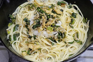 カルシウムたっぷり、大根やカブの葉っぱとチリメンジャコで和風パスタ