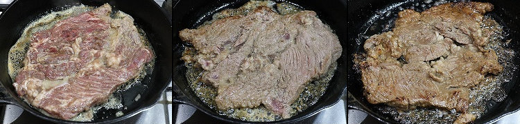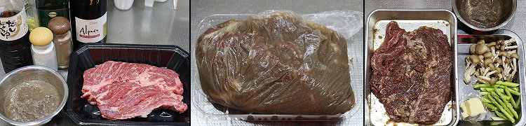 厚くて食べ応えのある牛ステーキ肉を、焼く前にマリネして柔らかくした。用意したステーキ肉は、オージービーフの肩ロースで1-1.5cm厚のもの。 マリネ液の主な材料はおろしたタマネギとマイタケで、強力なマイタケの蛋白分解酵素により肉が柔らかくなる。厚めのステーキ肉だが、2時間漬け込めば十分。 なお上記分量だと、ステーキ肉2-3枚分をマリネするのに十分な量となる。 おろしタマネギはソースとしてよく使うが(ビーフステーキ・おろしタマネギとポン酢のソース)、このマリネ液はだし醤油なども加えており、煮詰めればそのままソースとなる。 肉の焼き方は、片面40秒ずつ、その後は10秒ごとにひっくり返して計2-2分半焼くというやり方。焼き方については、“ビーフステーキ”・“分厚いビーフステーキ”・“ビーフステーキ・わさびソース”参照。  |