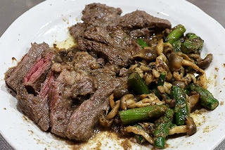 厚くてやや固めの牛ステーキ肉を、タマネギとマイタケでマリネして柔らかくしてから焼く。