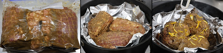 R8.1/25、ラピュタファームで行われた料理対決vol.1“豚肉料理”のメイン料理として出したのが、このもろみ漬け柚子ごしょう風味のローストポーク。漬け込みダレの配合は“豚骨付きスペアリブの柚子ごしょうもろみ漬け”とほぼ同じだが、用意した豚肩ロースは600-700gのブロック3本で、もろみも200g用意、14"deep CampDOで3本まとめて焼いた。下写真は試作時のもので豚肩ロースは約300g、もろみもその分少なく、またスペースがあったのでジャガイモも一緒に蒸し焼きにした。