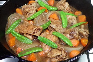 大きめの鶏モモ肉だったので、オリジナルより若干調味料類を増やしている。余っていたキヌサヤを彩りで添えたが、無くても良い