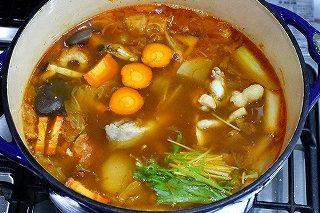 鍋の具材は、魚介類を中心にあり合わせの物で良い。魚の他、豚肉や鶏モモ肉を加えたり、生卵を入れたりするのも合う。