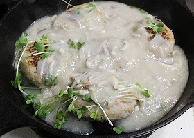擦りおろしたレンコンと角切りのレンコンで作ったハンバーグは、モチモチ・シャキシャキ、二つの食感が楽しめる
