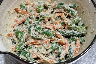 普通の和え衣は通常、豆腐1丁(300-320g)に炒りゴマ大さじ1-2杯(8-16g)くらいなので、ゴマの量はその数倍になる。 豆腐はしっかり水切りした木綿豆腐を裏漉しして、滑らかな口当たりの和え衣とした。 当初、豆腐1丁(300-320g)で和え衣を作っていたが量が多く和え衣が余ってしまうので、最近は豆腐150gで和え衣を用意している。 野菜類は白だしやだし醤油で下味を付けてから和え衣と和えるが、野菜によってやり方を変えた。スナップエンドウ・アスパラガスは塩茹でしてから白だしをかけている。ニンジン・コンニャクは薄めた白だしで茹でて下味を付けているが、塩茹でしてから白だしをかけても問題無い。 野菜類は、スナップエンドウに替えてインゲンを使ったりと組合せを変えることが多く、残り物を使ったりで量もアバウト。左・下写真の白和えは、冷凍インゲン・冷凍アスパラガスを使っている。  |