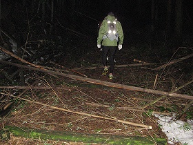 明木をスタート、一升谷へと左折。地元の人がいたので挨拶を交わしたが、一升谷が大変な状況になっているなんて話は聞かなかった。しばらく行くと、大きな倒木が道を塞いでいた。乗り越えたその先に、また倒木。あちらこちらで太さ20cmくらいの杉が真っ二つに折れたり根こそぎ倒されたりしており、また小枝も散乱していた。行く手を阻む多数の倒木、跨いだり下をくぐったり遠回りしたり、障害物競走のようになってきた。メガネ無しで周りがよく見えないので、ヘッドランプに加え手持ちのライトも点けて足下を照らしたが、しばしば立ち往生、走れる状況ではない。ようやくのことで峠の下の休憩所に到着、他のメンバーと合流した。明木からここまで1時間、普段の1.5倍の時間を要した。疲れて腹が減ったので外郎を食べ、5分くらい休んでみんなを追った。