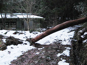 峠までのわずかな距離、ここもまた倒木が凄まじかった。峠を下って釿切の集落、50cmくらいの松が横たわっていた。その松を乗り越えると、その先にはブルーシート。 橋が無い!、どんな橋が架かっていたかよく覚えていないが、橋が無くて道が寸断されている。左の方に回り込んで小川を跳び越えた。右に行けば仮設の橋があったらしいが、メガネが無いので全く気がつかなかった。後日、聞いた話では、これも雪の重みで崩れ落ちたらしい。人間が乗ってもびくともしなかった橋が雪の重みで、、、 ようやくのことでR262号に上がり、メンバーと合流、釿ノ切峠は歩いて越えた。 |