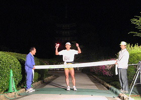3日夜、佐々並の先に収容に行ったランナーは、実は昨年トップのH浦さん。本部に帰る途中、トップ独走となったOさんに声をかける。そのOさんが瑠璃光寺に戻ってきたのは3日の23:45頃だった。ゴール写真を何枚か撮ったが、残念ながら五重塔の照明は消されていた。AM1時に2位のF島さんがゴール。この後しばらく間が空いたが、気が付くと五重塔の照明が灯され、闇夜に五重塔が浮かび上がった。