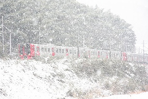 ![]() 門司港行きと荒尾行き 激しい雪でピントが合わない |