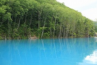 美望橋横の空き地に車を止める。正面には美瑛富士・美瑛岳が見えるはずだが、雲がかかっていた。遊歩道なんてものはなく、熊注意の看板を見ながら美瑛川沿いを歩いていく。 しばらく歩いて堰堤に着いた。その堰堤は、はっと息をのむ美しさ、真っ青な水をたたえていた。 目指す「青い池」は、その美しい川の横にあった。 |