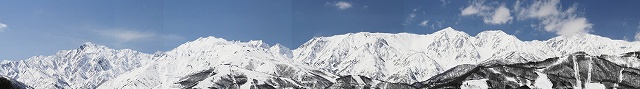 ![]() 五竜岳〜唐松岳〜鑓ヶ岳〜杓子岳〜白馬岳(白馬村北城にて、クリックで大きなサイズの写真1500×210pixel) |